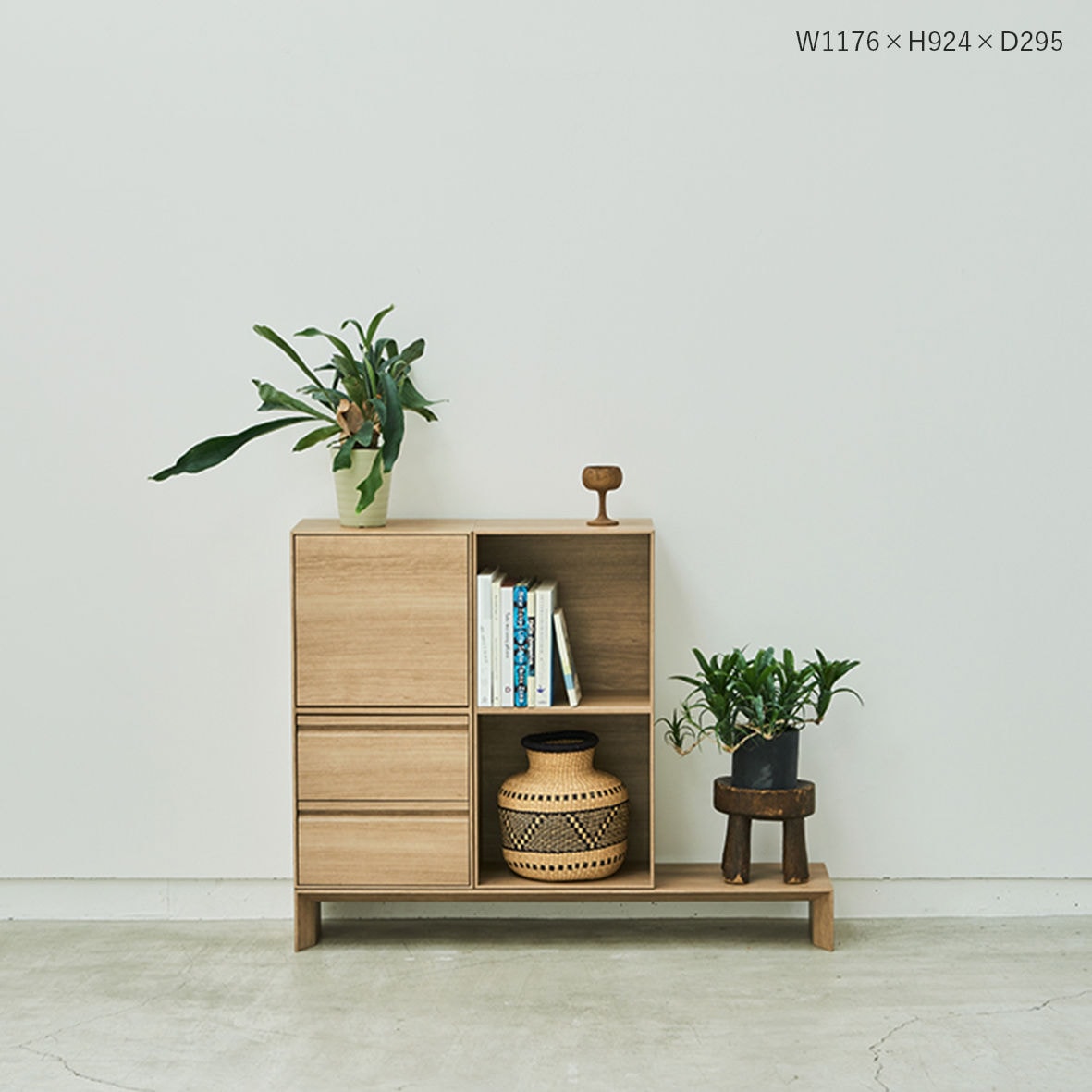 【使用例1】 脚の上にボックスを置くことで、軽やかな印象のサイドボードになります。脚の部分に直接ディスプレイをするのもおすすめです。