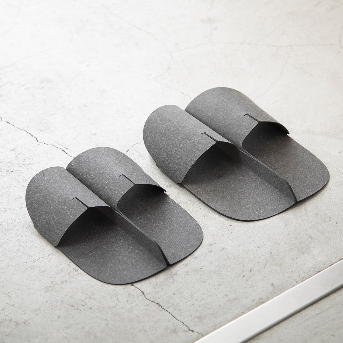 A seamless form when the slippers are placed side by side. Open-toe design for excellent breathability, crafted from a single piece of recycled leather.
